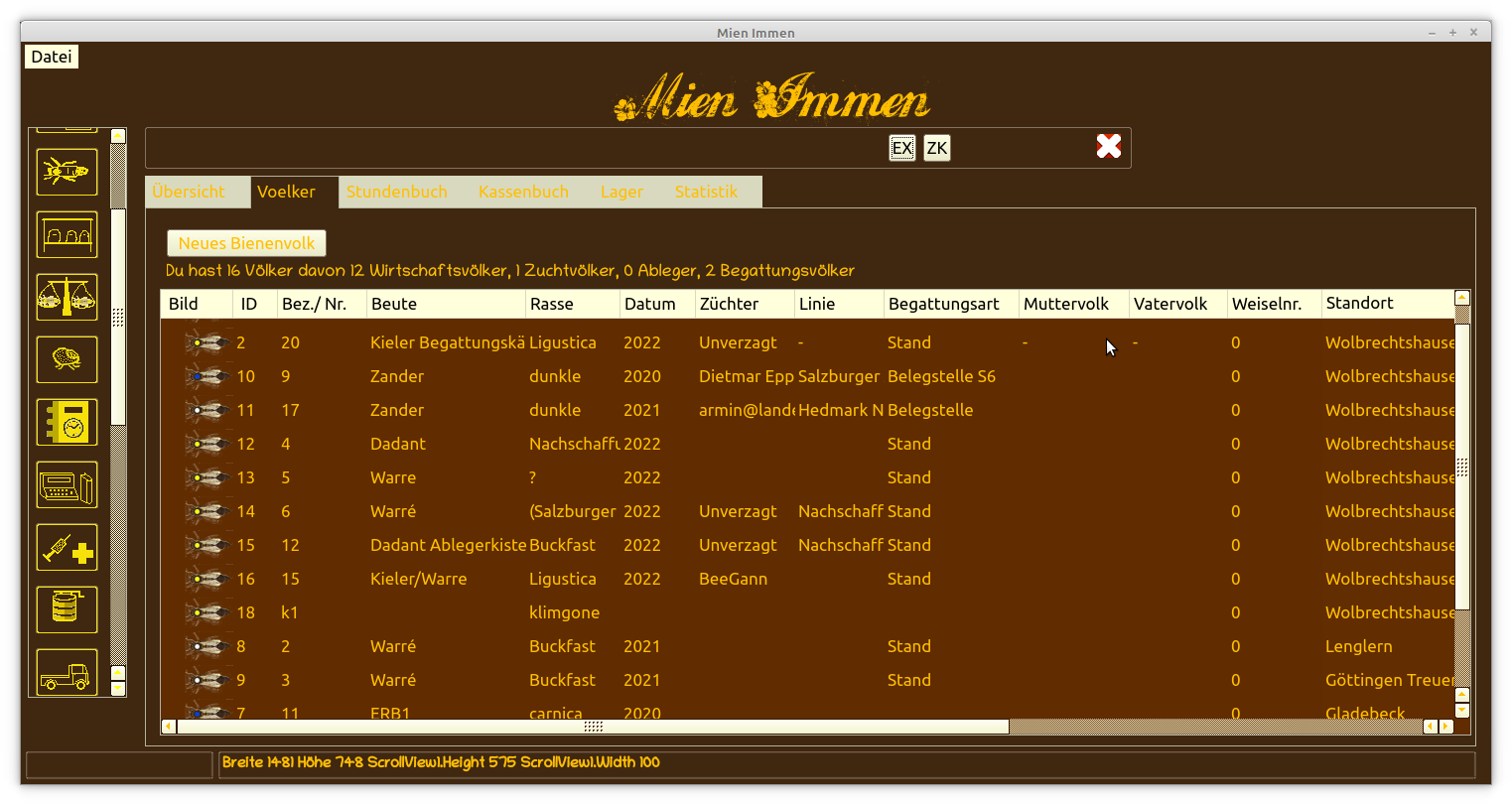 MienImmen wurde/wird von mir entwickelt um mir die Organisation in meiner Imkerei zu erleichtern. Ich stelle das Programm für die nicht Kommerzielle Nutzung kostenlos zur Verfügung. Das Programm umfast mitlerweile 25.299 Programmzeilen, 776 Funktionen und 57 Classen. Geschrieben habe ich das Programm in der Programmiersprache GAMBAS für LINUX Systeme. Es wird keine Version für Windows, Appel, Android geben den Datensammler will ich nicht unterstützen. Ebenso wird es keine Version fürs Handy geben denn das ist in meinen Augen völliger Quatsch.